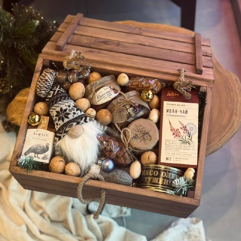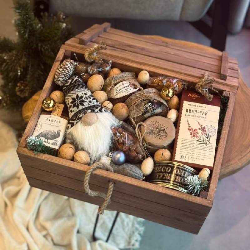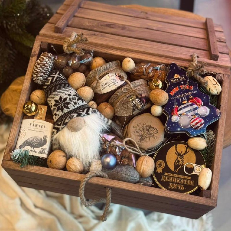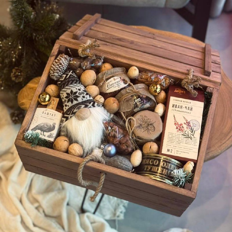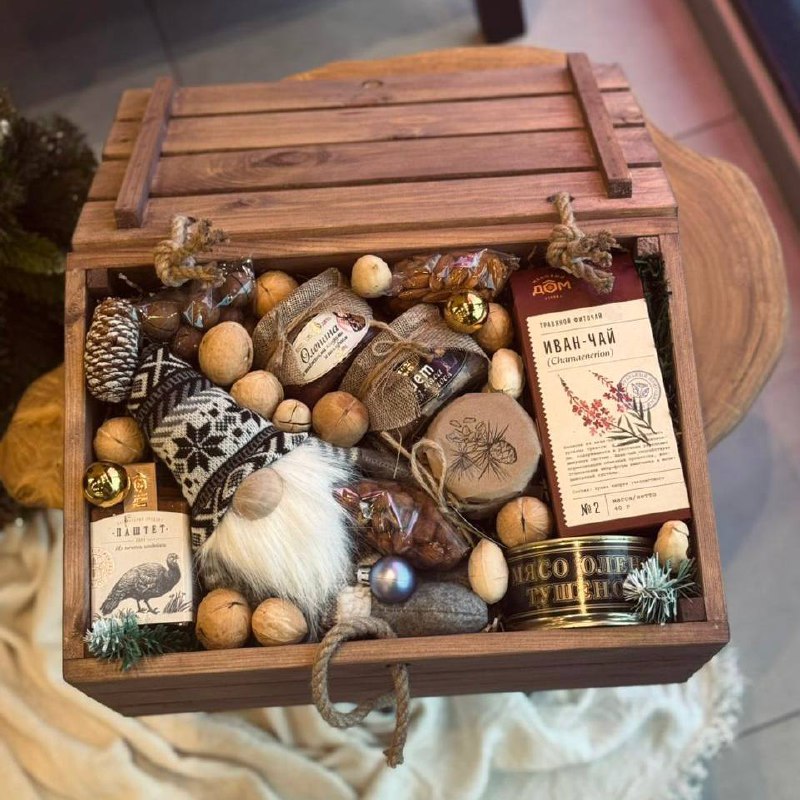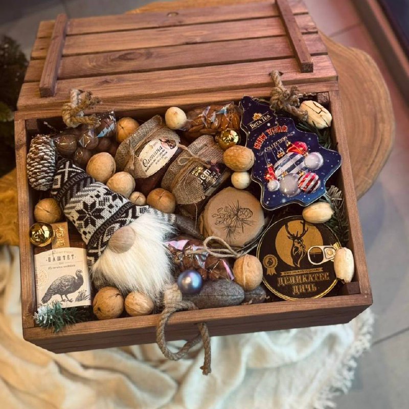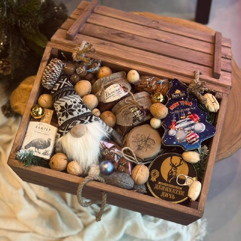 Деревянный подарочный сундук с деликатесами из дичи и новогодним гномом